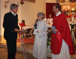 Ludwig Maier (links) leitet seit 33 Jahren den Kirchenchor und singt selber mit. Pfarrer Klaus Hofstetter und Gemeindereferentin Ursula Stacheder (Mitte) dankten ihm für sein Engagement zum Wohle der Gemeinschaft beim Gottesdienst in der Wildenwarter Christkönigskirche.