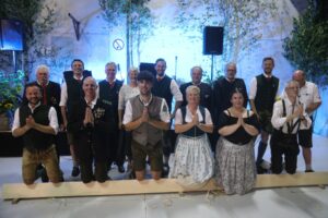 Harte Prüfungen auf ein scharfkantiges Holzscheitl: vorne von links nach rechts: Die kniehenden: Schirmherr und Bürgermeister Stefan Haberl, Wambachs 1. Schützenmeister Gerhard Grasser, 2. Schützenmeister Anton Kronseder, Festmutter Claudia Hartl, Festbraut Daniela Kordick, 1. Kassier Hans Kranich brachten ihre Bitten vor stehend hinten: Die Vorstandschaft des Schützenverein “Tannengrün Geislbach” besiegelten die Übernahme der Patenschaft