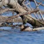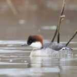 Typische Fischjäger sind der Kormoran und der Zwergtaucher. Dabei profitieren beide Arten von den Ästen und Stämmen im Wasser, welche die natürliche Fischaufzucht begünstigen oder auch schlicht als Ansitz dient. Nachdem ich erst einige male einen Zwergsäger gesehen habe, war dies meist erster photographischer Treffer. Dieser nahe Verwandte des einheimischen Gänsesägers lässt sich nur selten sehen, wobei die Weibchen öfter den langen Weg aus dem Norden bis in den Süden schaffen.