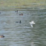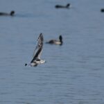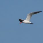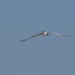 Am Irschener Winkel entdecke ich gleich durch ihren ruffreudigen Flug (https://xeno-canto.org/657049) zwei Raubseeschwalben. Dies ist die größte Seeschwalbe in Deutschland und fliegt ähnlich den Großmöwen mit einem starken Flügelschlag relativ hoch. Im Gegenteil zu den Zwergmöwen, welche gleichsam typisch einer Seeschwalbe wellenförmig knapp über der Wasseroberfläche fliegt.