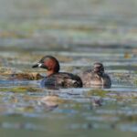 Auf dem Wasser forderte ein Kücken lautstark nach Nahrung, während die Mutter tauchertypisch nach Nahrung tauchte. Normalerweise sind die Zwergtaucher während der Brut und Aufzucht sehr scheu, doch diese beiden waren einfach direkt vom Ufer aus zu beobachten.