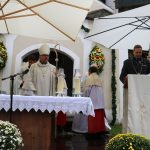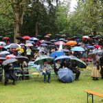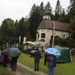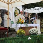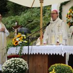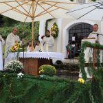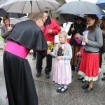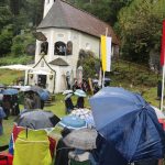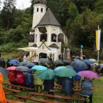 Hans Berger übernahm die musikalische Begleitung des Gottesdienstes zusammen mit zahlreichen Chorsängerinnen und –sängern und dem Müllner-Peter-Orchester. Alle miteinander begrüßten musikalisch die Pilger, die trotz des strömenden Regens auf dem kleinen Platz vor der Ölbergkapelle unter den Bäumen in Sachrang zusammen gekommen waren. Die Aschauer Alphornbläser stimmten die Gläubigen in den Gottesdienst ein. Als es ganz kurz einmal aufklarte, grüßte das Kaisergebirge mit dem ersten Schnee über die Tiroler Grenze. Diözesanbischof Hermann Glettler aus Innsbruck zelebrierte den feierlichen Festgottesdienst. Er versprach seine Predigt kurz zu halten – und er hielt sein Versprechen. „Wie kommen wir als Einzelne zum Frieden?“ fragte er die Gläubigen unter den Regenschirmen. Der heutige Tag mit der Wallfahrt helfe bereits zum Frieden zu kommen: „Runter vom Gas“ – schafft euch Verbindungen und steht zueinander. Schließlich rief er noch auf: „Seids gscheid“ und benutzt euren Verstand, dafür habt ihr ihn bekommen“ Er versuchte aktuell anwendbare Antworten für alle auf diese Anforderungen zu finden.