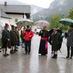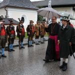 • Gebirgsschützenhauptmann Hubert Stein von der Aschauer Gebirgsschützenkompanie begrüßte noch vor dem Festgottesdienst zusammen mit dem Vorsitzenden des Müllner Peter Freundeskreises Dieter Höpfner und Bürgermeister Simon Frank den Diözesanbischof von Innsbruck Hermann Glettler an der Kirche Sankt Michael in Sachrang und stellte die Front der angetretenen Schützen-Formationen mit ihren Hauptleuten vor.