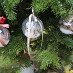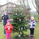 Foto: Roßmeier:  Die Schwestern Paula und Charlotte hängen ihre selbstgestalteten Kugeln an den Christbaum vor dem Vereinsheim. Jugendleiterin Katrin Fuchs freut sich über die tollen Ideen.