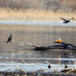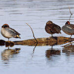• Die nächste Station ist die Hirschauer Bucht. Weitere Frühlingsboten halten sich dort auf: Kiebitze. Leider fliegen sie zu weit vom Turm entfernt, so dass die Fotos nicht besonders schön sind. Auch ein Großer Brachvogel ist mitgeflogen. Auf dem Wasser sind ebenfalls Krickenten zu sehen. Nach einiger Zeit gesellen sich noch mehr dazu.