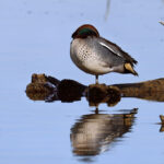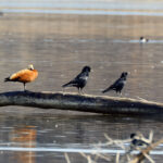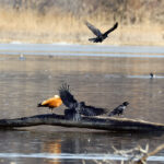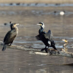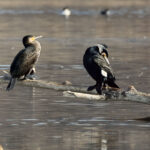 • Zuerst wird die Prienmündung aufgesucht. Auf einem im Wasser liegenden Baumstamm hat sich eine einzige Brandgans eingefunden. Das herumgefliege der Rabenkrähen bringt sie nicht aus der Ruhe. Auch die beiden Kormorane sind davon unbeeindruckt und wärmen und putzen sich. Schön anzusehen sind immer wieder die kleinen Krickenten beim Mittagsschlaf. Ein Weibchen hat noch Hunger. Bei den Kormoranen zeigt sich das Männchen im Prachtkleid von seiner attraktiven Seite: Scheitel und Nacken und im Bereich der Flanken mit weißem Gefieder. Die ersten Frühlingsboten sind da. Der Gesang der Stare ist besonders schön. Noch sind sie scheu und sitzen hoch oben auf den Bäumen. An einem Baumstamm wachsen vermutlich Schwefelporlinge (Gattung Laetiporus).