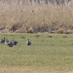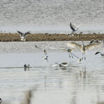 • Nun geht es zur letzten Station, dem Lachsgang. Hier hält sich ein größerer Trupp Blässgänse auf. Auf großer Distanz lassen sich die aufmerksamen Gänse fotografieren. Daneben sind sehr viele Graugänse auf den Wiesen. Auf der Landzunge ist Betrieb. Viele Mittelmeermöwen, einige Kormorane und Graugänse ruhen dort. Die Blässgänse sind auch dort eingetroffen. Mehrere Singschwäne halten ihren Verdauungsschlaf. Hier fühlen sie sich sicher. Zurück bei den Wiesen. Ein großer Trupp Graugänse umrundet fliegend mehrmals die Wiesen und landet dann auf einer, wo bereits eine Gruppe Graugänse sich aufhält.