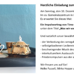 Liebe Interessierte an den Vision-Yamalé Aktivitäten, am kommenden Sonntag, den 10. Dezember um 16.30 Uhr laden wir zu unserem letzten Café Touba in diesem Jahr ein. Wir treffen uns im Gemeindezentrum der ev. Kirche in Prien und haben sowohl inhaltlich als auch kulinarisch wieder einiges für Sie vorbereitet.