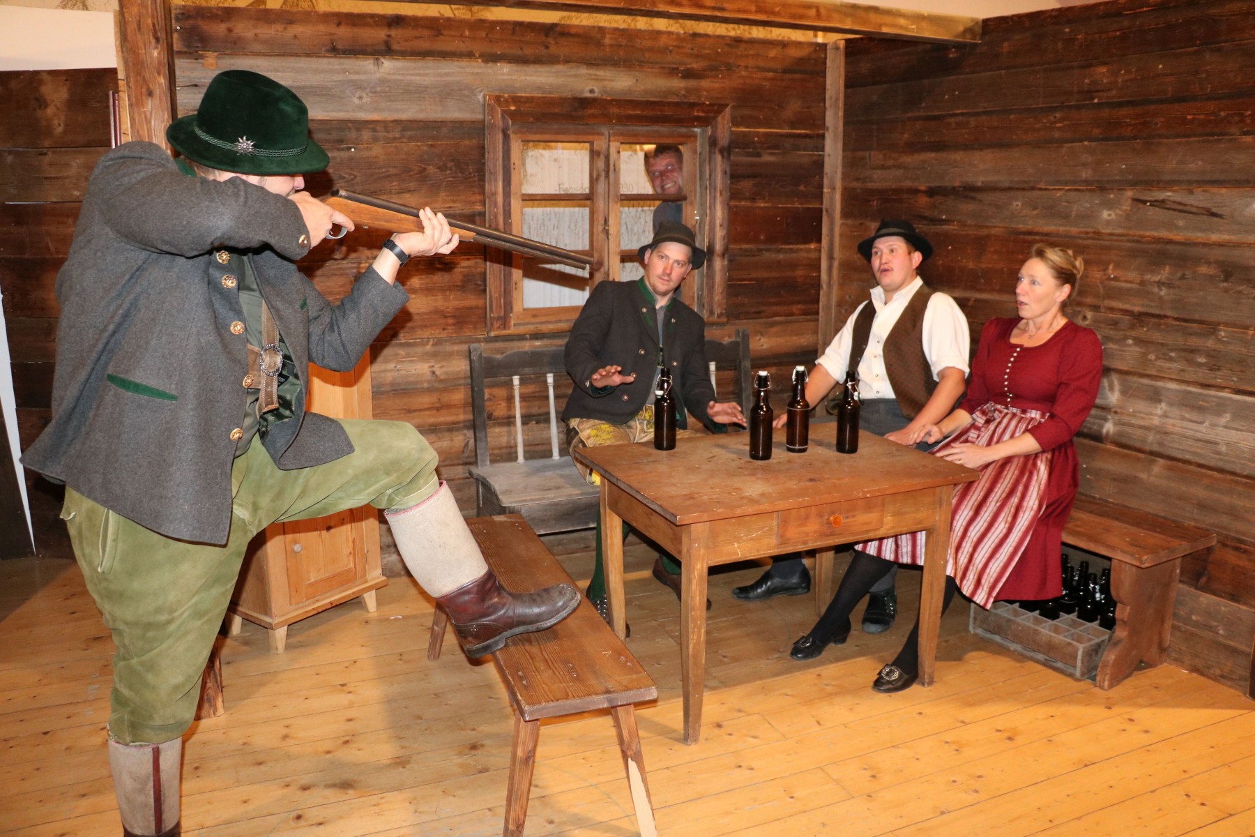 Da hat er sich zu früh gefreut der bayerische Teufel Luziferius Sparifankerl (Thomas Fischer, hinten im Fenster), so schnell begeht der Baron Ferdi (Schorsch Wörndl, links) keine Untat. Die Blechhoferin (Elfriede Haller), Nepomuk Stutz (Sebastian Bauer) und Bertl Goaßhofer (Sepp Hamberger) sind dennoch starr vor Schreck. (Von rechts)