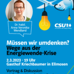 Am Donnerstag, 2. März 2023 um 19 Uhr laden die CSU Ortsverbände Bad Aibling und Willing im Gasthaus Kriechbaumer in Ellmosen (Ellmosen 60, 83043 Bad Aibling) zu einem interessanten Informations- und Diskussionsabend ein. Unter dem Titel „Müssen wir umdenken? Wege aus der Energiewende-Krise“ wird die Osteuropa- und Technikhistorikerin aus Marburg, Frau Dr. Anna Veronika Wendland, die aktuelle Lage analysieren und einen Ausweg aus dem Dilemma vorstellen: ein integriertes System aus Erneuerbaren Energien und Kernenergie, das Klimasicherheit und Versorgungssicherheit versöhnen kann. Wendland ist eine gefragte Gesprächspartnerin der Medien für Fragen der Energiedebatte und der Reaktorsicherheit (bspw. im Juni 2022 hier im SWR).