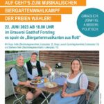 Ab 18 Uhr spielen die ” Biergartenmusikanten aus Rott” zur Unterhaltung auf, der Landtagskandidat der FW, Sepp Lausch wird sich kurz vorstellen, ebenso wie die Bezirkstagskanditaten Sepp Hofer und Barbara Stein. Alle drei werden für die Fragen und Anliegen der Bürger und Bürgerinnen zur Verfügung stehen und der Wirt wird für Speis und Trank sorgen. Weitere Termine sind der 5.7. beim “Wirt vo Dred” in Jarezöd, am 20.7. beim Wirt in Hirnsberg und am 10.8. im Gasthof Kalteneck in Albaching, immer auch mit verschiedenen Musikgruppen. Bei schlechtem Wetter findet die Veranstaltung jeweils in der Wirtsstube statt.