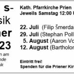 Nach dem erfolgreichen Start im vergangenen Jahr veranstaltet die katholische Pfarrei Prien auch heuer wieder einen „Orgel-Sommer“. An vier Samstagen im Juli und August wird nach dem 12-Uhr-Glockenläuten in der Pfarrkirche Mariä Himmelfahrt Prien eine halbe Stunde Orgelmusik erklingen. Studierende und ehemalige Studierende der Münchner Musikhochschule lassen die Priener Woehl-Orgel auf je ganz unterschiedliche Weise erklingen und freuen sich auf viele Besucher. Die Mittagskonzerte finden an den Samstagen 22. Juli (Filip Šmerda), 29. Juli (Stephan Pollhammer), 5. August (Aaron Voderholzer) und 12. August (Bartholomäus Prankl) jeweils um 12 Uhr in der kath. Pfarrkirche Prien statt. Der Eintritt ist frei. Spenden für die Priener Kirchenmusik sind erbeten.