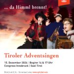 Als Veranstalter hat der Tiroler Volksmusikverein für die zwei Auftritte am Sonntag, 15.12. (14.00 & 17.00 Uhr) wieder ein stimmungsvolles Programm zusammengestellt. Alle BesucherInnen sind um 16.00 Uhr im Kristall Foyer des Congress Innsbruck auch zum gemeinsamen Weihnachtsliedersingen eingeladen. Der Eintritt hierzu ist frei. Tiroler Adventsingen 2024- …da Himml brennt!