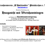 Der Trachtenverein D’Holzlandler Pleiskirchen veranstaltet am kommenden Freitag, 16. Dezember 2022 um 20 Uhr im Gasthaus Münch eine Christbaumversteigerung mit Hoagascht und Wirtshaussingen. Das Besondere an diesem Brauchtumstermin ist das Angebot an zahlreichen selbstgefertigten Gegenständen wie z. B. Kripperl, Christbaumschmuck, gestickte Bilder, Trachtenutensilien etc., die sicherlich auch passende Weihnachtsgeschenke darstellen und vom “Versteigerer” Heinrich Zagler in bewährter humorvoller Weise angepriesen werden.