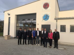 Neben Vertretern der Feuerwehr und des Sportvereins kamen auch zahlreiche Akteure aus der Verwaltung zur offiziellen Einweihungsfeier: (4.v.r.) Architekt Josef Böhm, Bürgermeister Andreas Brigl (3.v.r.), Monika Hirl vom ALE Oberbayern und stv. Landrat Bernhard Sammilller. (ganz rechts).