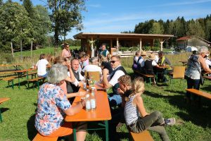 Der neue Lehrbienenstand, eine luftige Holzkonstruktion. Die beiden Bürgermeister von Frasdorf Daniel Mair (am ersten Tisch links) und Aschau Simon Frank (mit dunkler Sonnenbrille) informierten sich über das neue Gebäude an der Straße nach Aschau.