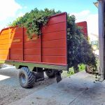 Zuerst einmal muss ein Hopfengarten angelegt werden. Die Pfähle dafür sind bei den Schneiders überwiegend Holzpfähle aus dem eigenen Wald, es können auch länger haltbare Pfosten aus Beton verwendet werden. Diese werden über eine Draht- / Seilkonstruktion alle miteinander verbunden, um einen stabilen Hopfengarten zu erreichen. Im Winter schon werden mit einer Kanzel am Frontlader des Schleppers bei jedem Hopfenstock dünne Drähte aufgehängt, an denen die Triebe dann später emporwachsen können. Mitte März beginnt die Pflanze Triebe auszubilden. Ab Ende April sucht sich der Hopfenerzeuger drei schöne, starke Triebe heraus, die er an den Hopfendraht andreht. Im Laufe des Wachstums muss der Landwirt – je nach Sorte und Windaufkommen – dem Hopfen mehrere Male beim Hochwachsen am Draht unterstützen. Über das Jahr sind bis zu zehn Besuche des Bauern der Pflanze auf dem Hopfengarten keine Seltenheit. In diesem Jahr war der Erntebeginn witterungsbedingt etwas später, in der Regel findet die Ernte des Hopfens Ende August bis Ende September statt.