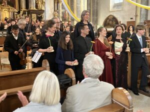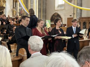 Der Tenorsolist Jan Kobow unterstützte als Obadjah inhaltlich die Aussage von Elias und gestaltete seine Rezitative und Arien ebenso brillant und mit perfekter Aussprache und Tonsetzung („Hilf deinem Volk, du Mann Gottes!“, „So ihr mich von ganzem Herzen suchet“, „Du Mann Gottes, lass meine Rede“). Samira Taubmann als Witwe bestach durch eine wunderschöne, kristallklare Sopranstimme in ihren Arien und Rezitativen („Höre Israel“), sowie im Duett mit Elias („Was hast du an mir getan“) und dem Chor („ Herr, höre unser Gebet!“) oder im Solisten-Quartett in bezauberndem Zusammenklang. Die Altistin Monika Schwabegger als Engel und als Königin und Baalsanhängerin hetzt das Volk auf gegen Elias auf („Weh ihnen, dass sie von mir weichen“, „Seraphim standen über ihm“). Eine grandiose Aufführung mit vielen Zaubermomenten. Applausstürme und Präsente für die Solisten.