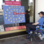 Fotos: Helga Stampfl – Projekt „Emotionen“ von Mathias Stampfl am Schaufenster von Optik Schmetterer-Stein in der Bernauer Straße in Prien a. Chiemsee – u.a. Mathias Stampfl vor seinem Werk und Mathias Stampfl mit Petra Stein und mit seiner Mutter Helga.