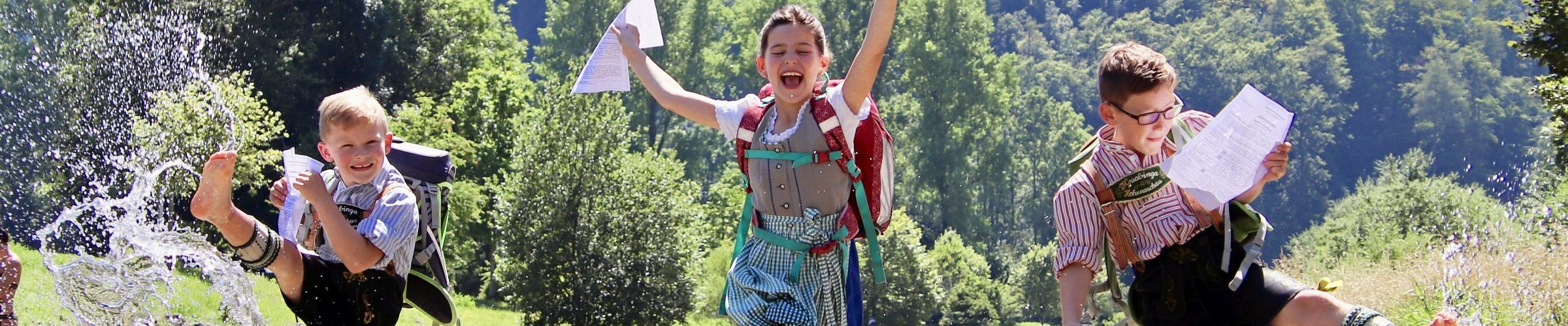 Auch diese drei Schüler der Preysing Grundschule Aschau i.Chiemgau freuen sich total auf die schönste Zeit des Jahres. Magdalena Hendlmeier (Mitte) und die Brüder Hannes (links) und Sebastian Scholl (rechts) sind im Bankerldorf® Aschau i.Chiemgau zuhause. Was kann es da Schöneres geben als mit bester Ferienlaune schon mal beim Nachhauseweg in das kühle Nass der Prien unterhalb von Schloss Hohenaschau (im Hintergrund zu sehen) einzutauchen. Veranstaltungstipps für die Ferien gibt es bei der Tourist Info Aschau i.Chiemgau, Tel. 08052/90490 bzw. unter www.aschau.de.