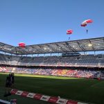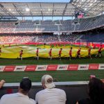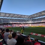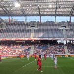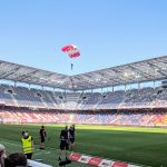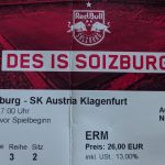 In der Red Bull Arena herrschte eine tolle Atmosphäre. Vor dem Anpfiiff unterhielt der Stadionsprecher die Fans mit Informationen, Jugenfussballer traten auf und Fallschirmspringer landeten auf dem Spielfeld. Ich hatte einen Platz ganz nah am Geschehen, aber etwas weit rechts. Da Salzburg von links nach rechts spielte, war das aber ganz gut. Gegen den Aufsteiger dachte ich gibt es mindestens 5 Tore, das wird bestimmt unterhaltsam. Und es ging auch gleich rasant los: schon der erste Angriff führte zum 1:0 durch Jungtalent Karim Adeyemi, der erst vor kurzem mit der deutschen U21 Europameisterschaft feiern konnte und der vor dem Sprung in die Nationalmannschaft steht. Es stürmten weiter, wie erwartet nur die Roten Bullen und mein Platz war wirklich sehr gut, bis es den ersten Konter der Klagenfurter gab, der prompt zum Ausgleich führte und den ich n ur aus der Ferne mitbekam. Die Salzburger zeigten sich geschockt, ihr Spiel lief nicht mehr besonders gut und die Gäste verteidigten jetzt besser. RB, das einige seiner Stammspieler für das Rückspiel gegen Brøndby IF am Mittwoch schonte, gelang bis zur Pause nur noch ein Aluminiumtreffer und ein Abseitstor.