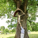 Fotos: Das Pauln-Kreuz – einmal mit Sepp Entfellner – und nach der Abnahme von links Sepp Entfellner mit Hermann Ruhland senior und junior