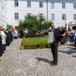 Die Klosterschwestern dankten den Theaterspielern für ihr Engagement und die großzügige Spende und luden sie ein, die schöne und langjährige Tradition des Irmengardfestes mitzuerleben. Nach dem Gottesdienst zog ein Festzug, an dem sich neben geladenen Ehrengästen, der Geistlichkeit und den Schwestern des Konvents immer auch eine Blaskapelle aus der Region und die Gebirgsschützenkompanie aus Bad Endorf beteiligt, vom Münster zum Klosterhof. Dort endet die Prozession mit einem zweifachen Salut zu Ehren der Schutzheiligen. Natürlich darf auch das gemütliche Beisammensein nicht fehlen. Bevor es mit dem Dampfer zurück nach Gstadt ging, warfen die Theaterspieler einen letzten Blick auf das Haus Scholastika. Zahlreiche Sanierungsmaßnahmen wurden bereits durchgeführt, darunter die Trockenlegung des Mauerwerks, der Einbau einer Wärmedämmung und eine Erneuerung des Daches. Viele Arbeiten stehen aber noch aus und müssen finanziert werden. Dabei wird das Spendengeld sicher helfen.