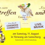 Eine zwanzigjährige Tradition hat auf dem Samerberg das Ententreffen in Törwang. Heuer findet diese Kombination aus raren 2 CV-Autos und einzigartiger Gastronomie am Samstag, 11. August statt. Auch heuer werden wieder rund 80 mehr oder weniger originelle Auto-Enten aus ganz Deutschland und aus den alpenländischen Nachbarländern erwartet, um sich ein buntes und fröhliches Stelldichein zu geben. Das Programm beim Ententreffen mit Dorffest beginnt um 10 Uhr mit dem Eintreffen auf der Entenwiese, mittags ist dann gemeinsames Entenessen vom Grill und um 14 Uhr begibt sich die Schar der Auto-Enten auf eine etwa zweistündige Rundfahrt rund um den Samerberg. Hernach beginnt das Dorffest mit Kaffee und Kuchen, mit einem bunten Kinderprogramm (Hüpfburg, Enten-Ralley und Enten-Angeln) sowie mit der Siegerehrung für besonders schöne und weit angereiste Auto-Enten. Die musikalische Unterhaltung beginnt ab 17 Uhr unter dem Motto „Feuer und Flamme“ (stimmungsvolles nostalgisches Dorf-Ambiente unter anderem mit Feuerschalen, Kerzen, Fackeln), der offizielle Bieranstich erfolgt um 19.30 Uhr alsdann spielt bei schöner Witterung die Kapelle „Chiemsee Cowboys“ zur Unterhaltung auf. Das Entenwirt-Team bietet an verschiedenen Ständen kulinarische Köstlichkeiten wie Heubraten, Entenhaxen und Entencurry-Gemüse vom Fensterlbuffet. Nähere Informationen gibt es beim Entenwirt, Tel. 08032-8815 oder im Internet unter www.entenwirt.de, bei Übernachtungswünschen steht die Gäste-Information Samerberg, Tel 08032-989419 oder gaeste@samerberg zur Verfügung.