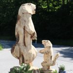 Über 150 Jahre alt war der Baum, den Motorsägenkünstler Guntram Prochaska für sein Kunstwerk bereit stellte. Er wuchs irgendwo am Oberrhein in der Heimat des Künstlers. Auf dem 20. Sachranger Markt begann er mit seiner Kettensäge sein Werk und die Holzspäne flogen beim Schnitzen nur so nach allen Seiten. Schnell und grob mit der Kette vorarbeiten, hier ein Eck wegnehmen, dort eine Linie begradigen, ein wenig schleifen und schon nach kurzer Zeit wurde den Besuchern klar, dass tatsächlich ein Murmeltier in dem Baum verborgen war. „Holz lebt und verändert sich. Ich erschrecke das Holz mit der Kettensäge so sehr, dass es freiwillig seine Form preisgibt“, so Prohaska. Unaufhörlich kreischte die Säge und mit jedem Schnitt wurden die Konturen des Murmeltieres besser sichtbar. „Die beiden Murmeltiere können noch nicht dableiben, erst in der „Landart-Ackerdemie bei mir zu Hause in Grötzingen erhalten sie ihren Feinschliff“, so der „Holzsägekomponist“, der den Bäumen auf höchst ausgefallene Weise neues Leben einhaucht. Dass es zwei Jahre dauern würde, bis die beiden Murmeltiere wieder ins Obere Priental zurückkehren konnten, das ahnte zu diesem Zeitpunkt noch keiner. Sachrang erhält damit nach zweijähriger Wartezeit eine der „echten Prochaska-Skulpturen“ und reiht sich damit in eine Reihe von 40 Ländern ein, in denen die Prochaska-Kunstwerke schon bewundert werden können. Seine detailreich gestalteten Holzmonumente sieht der – weltweit als „ Künstler mit der Kettensäge“ – bekannte Prochaska auch als universelle Kunstform an, die Kulturen zusammenführt und den Menschen ihren Ursprung wieder bewusster macht.