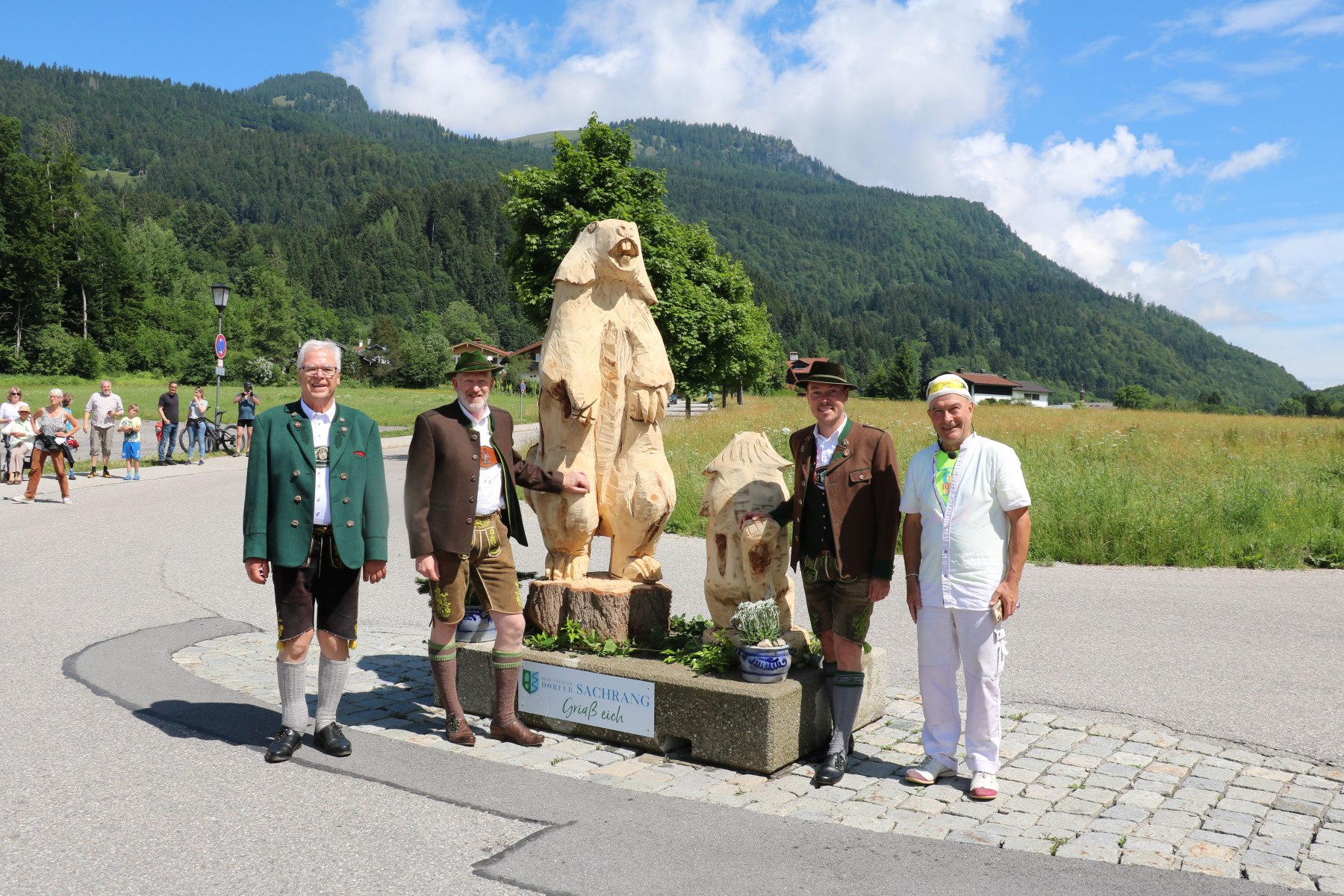 Zwei Murmeltiere bewachen künftig den südlichen Orteingang von Sachrang. Holzsägekomponist Guntram Prochaska (rechts) schnitzte sie beim 20. „grenzenlosen“ Sachranger Bauern- und Kunsthandwerker Markt, aber die Pandemie verhinderte bisher die Aufstellung der beiden Skulpturen. Gemeinsam mit dem Künstler enthüllten der Vorsitzende des Verkehrsvereins Benno Pertl, zweiter Bürgermeister Michael Andrelang und Tourismuschef Herbert Reiter (von links) die beiden „Mankeis“ an der Einfahrt ins Bergsteigerdorf.