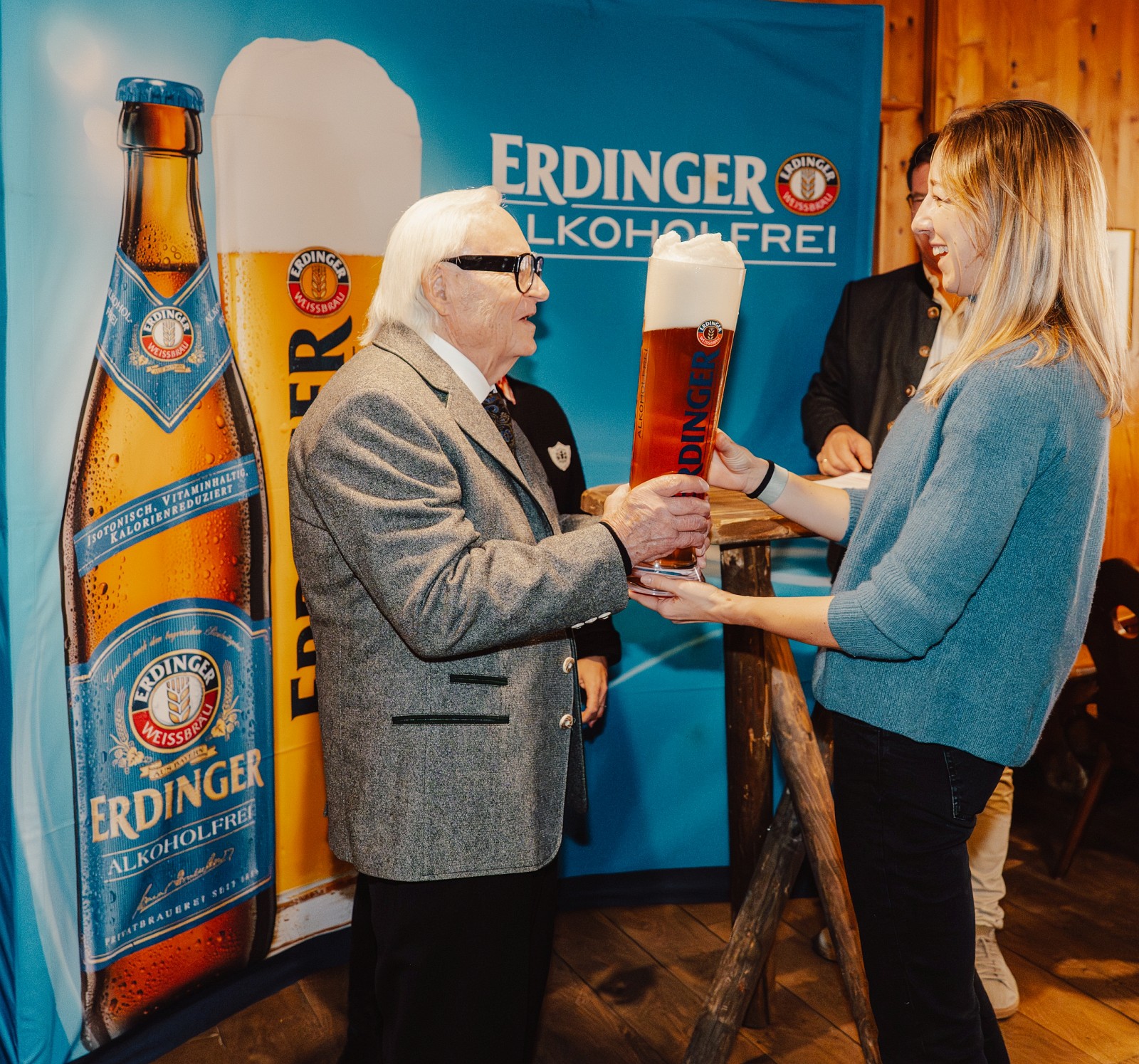 Werner Brombach, Inhaber der Privatbrauerei ERDINGER Weißbräu und großer Biathlonfan, überreicht Franziska Preuß das 3-Liter-Siegerglas ERDINGER Alkoholfrei.