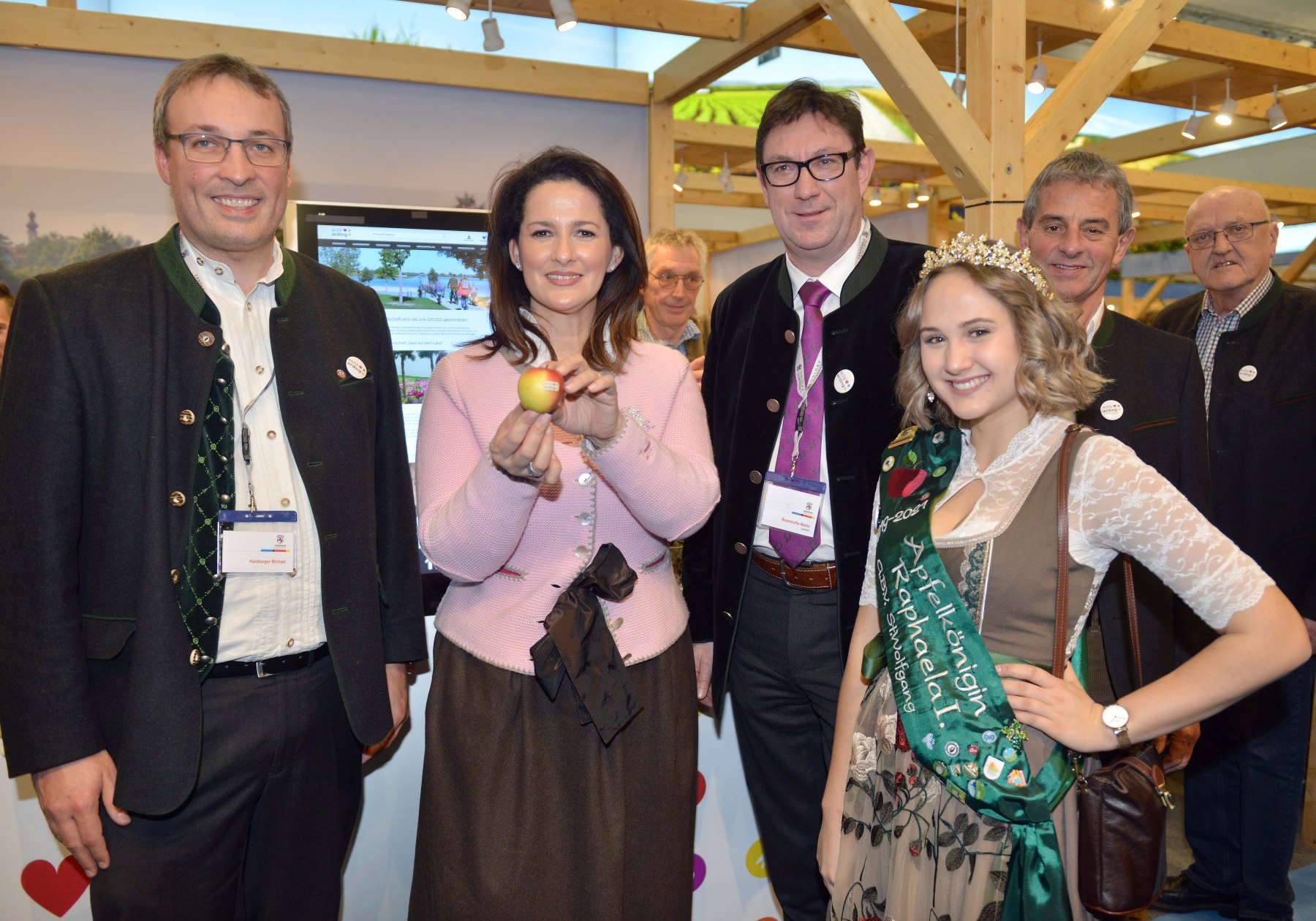 Michael Hamburger, Ministerin Michaela Kaniber, Landrat Martin Bayersdorfer, Apfelkönigin Raphaela Müller und Franz Hofstetter.