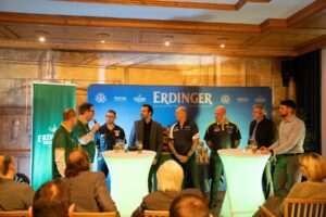 v. l. n. r.: Dr. Stefan Huckemann (Geschäftsführer ERDINGER Weißbräu), Wolfgang Kuffner (Geschäftsführer ERDINGER Weißbräu), Lukas Wenig, Philip Brzezinski (PDC Europe), Russ Bray, Michael van Gerwen, Werner von Moltke (Geschäftsführer PDC Europe) und Konstantin Daum (PR-Manager ERDINGER Weißbräu)