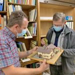 Bericht/Repro/s: Hötzelsperger – Eindrücke von der Einweihung des Bahnhofs Frasdorf im Jahr 1914 – Aufgelöst wurde er vor 50 Jahren. Foto hö: Bürgermeister Daniel Mair (li.) und Rupert Wörndl im Archiv der Gemeinde, dort gibt es auch einen Bausatz zum ehemaligen Frasdorfer Bahnhof.