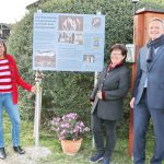 - Die Vorsitzende des Heimat- und Geschichtsvereins Dr. Natascha Mehler, die Historikerin Martina Stoib und Aschaus Bürgermeister Simon Frank vor der neuen Info-Tafel zum Gedenken an den Aufenthalt der drei bayerischen Königstöchter im Jahre 1918 in Hintergschwendt