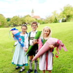 Die  drei Trachtenkinder von „Kientaler Erling“  Regina Pfänder sowie die Cousin Korbinian und Josefine Sailer sind zusammen in die erste Klasse der „Carl-Orff-Grundschule Andechs“ gekommen.