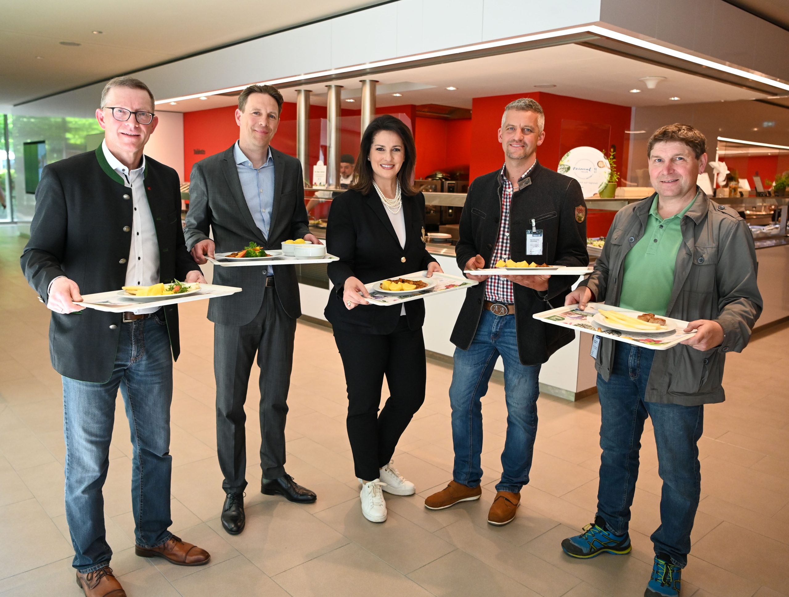 (v. l.) Walter Kratzer, Leiter Gastronomie, Lothar Scharpe, Fachbereichsleiter, Ministerin Michaela Kaniber, Andreas Aigner, Landwirt und Lieferant, Erwin Heckl, Landwirt und Spargellieferant.
