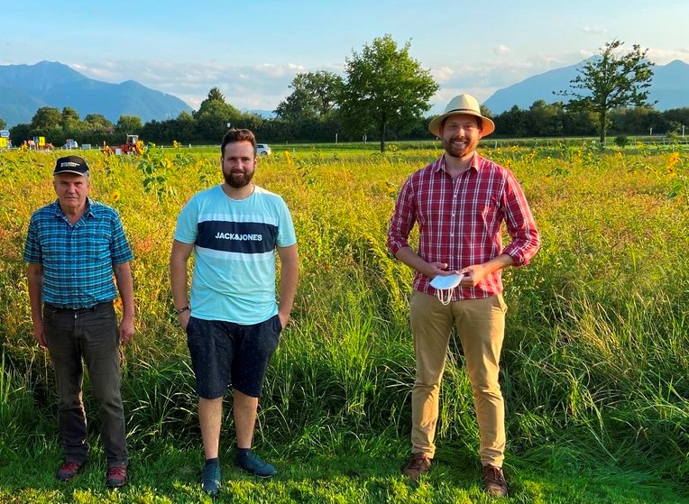 Das Anfang September 2021 bei der Besichtigung der Blühflächen entstandene Bild zeigt von links den landwirtschaftlichen Projektpartner Hans Maier, dessen Sohn, landwirtschaftlichen Projektpartner und Gemeinderatsmitglied in Übersee Christian Maier gemeinsam mit dem Zweiten Bürgermeister der Gemeinde Unterwössen Johannes Weber, die sich über den gelungenen Projektausgang freuten. Sie hoffen für das aktuelle Jahr auf ebenfalls gutes Wachsen und Gedeihen. Ihn freute die Patenschaft seines Ortsverbandes und die gemeinsame Zusammenarbeit mit Hans Maier und Christian Maier. Bild: Klaus Hellmich, Unterwössen.