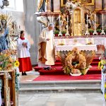 Ruhestandspfarrer Josef Kreuzpointner freute sich, dass er mit den Gläubigen das Erntedankfest und das Patrozinium in der Pfarrkirche feiern konnte. Gemeinsam mit den Kirchenbesuchern dankte er Gott für die Ernte der Früchte der Erde und erinnerte an die Arbeit der Menschen, die sie mit viel Mühe  angebaut haben. Die reichlichen Erntegaben mahnen uns auch an die Menschen zu denken, die Not leiden müssen und bei aller Dankbarkeit, soll auch das Teilen nicht vergessen werden. Der Pfarrer stellte die Fragen, ob wir wirklich so leben, dass auch andere Menschen gut leben können, dass auch die Tiere und Pflanzen noch ihren Lebensraum finden und ob eine gerechte Teilung der Güter möglich ist.