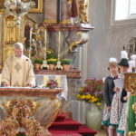 Die Kinder strömten mit ihren Erntekörbchen zur Kirche und stellten sie am festlich geschmückten Altarraum ab. Pfarrer Martin Straßer freute sich über die vielen Gaben, den Erntedankkranz mit dem Brot, den Schmuck vom Almabtrieb und über die Trachtenkinder, die die Erntedank-Messe mitgestalteten. Er bezeichnete die Kirche an diesem Tag als ein „Schmuckkasterl“, besonders auch zu dem Patroziniums-Gottesdienst für den Heiligen Remigius.