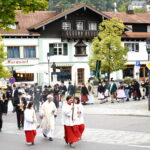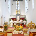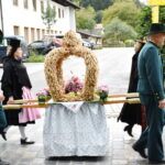 Die Musikkapelle, der Trachtenverein mit den Fahnenträgern und der Schützenverein versammelten sich am Ritter Marquart Brunnen bis sie vom Diakon Johannes Notter und den Ministranten abgeholt wurden. Gemeinsam ging ein Zug -angeführt von der Musikkapelle mit dem Marsch „Mein Heimatland“- und der großen Erntekrone zur Kirche „Zum kostbaren Blut“.