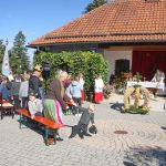 Der weitläufige Vorplatz vor dem Leichenhaus war Mittelpunkt der Messfeier zum Erntedankfest in Neubeuern – so konnten die Abstände und Coronaregeln eingehalten werden. Im Mittelpunkt vor dem Altar war die beim “Schopper” in Neuwöhr gebundene neue Erntekrone. Ein Zeichen der Verbundenheit und Dankbarkeit, für ein Leben in Einklang mit Natur und Schöpfung. Die Fahnenabordungen formierten sich im Kreis um das Geschehen. Pfarrer Christoph Rudolph vermittelte den Dank an das Geschaffene, verbunden mit der Einheit im Glauben an Gott. Den mit Feldfrüchten geschmückten Altar zierte auch eine Butterfigur, diesmal weil es prägend für die Zeit ist mit dem Abild der Hl. Corona. Die Figur wurde wieder wie alljährlich von Amalie Scherer geschaffen. Die Segensbitten galten auch der Vernunft mit weniger zufrieden zu sein, die Werte besser zu schätzen und im Einklang mit der Natur zu leben. Der Pfarrer erbat den göttlichen Segen und Schutz für die Arbeit und unsere Heimat. Gemeinsam sang man zum Abschluß “Großer Gott wir loben Dich”