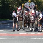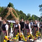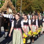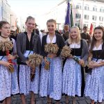 Bei Kaiserwetter startete der Kirchenzug um 9.15 Uhr in der guten Stube Rosenheims, dem Max-Josefs-Platz. Mit dabei über 30 Vereine, Musikkapellen, Pferde-Gespanne und Erntekronen aus Stadt und Landkreis. Für die Erler war die Teilnahme Schwertarbeit. Rund 300 Kilogramm wiegt das Erler-Kreuz, dass sie auf ihren Schultern durch die Stadt trugen. Gut vier Stunden Arbeit stecken in der Erntekrone, die von der Landjugend Vogtareuth angefertigt wurde. Dabei mitgeholfen hat auch Johanna Mayer aus Pfaffing, eine der diesjährigen Miss-Herbstfest-Finalistinnen. „Das Erntedankfest ist jedes Jahr wieder schön“, meinte sie. Besonders freute sie sich mit ihren Freundinnen Hildegard, Magdalena und Barbara auf das gemeinsame Beisammensein auf der Wiesn. Vor der gemütlichen Einkehr in die beiden Festzelte stand aber erst einmal Andacht im Mangfallpark Süd auf dem Programm.
