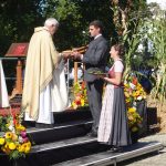 Dekanin Dagmar Häfner-Becker wies zu Beginn des Festgottesdienstes darauf hin, wie wichtig religiöse Feste für die Menschen sind: „Sie schenken viel Kraft“. Für Dekan und Domkapitular Daniel Reichel war es das letzte Erntedankfest, dass er in Rosenheim zelebriert. Vor wenigen Wochen wurde bekannt, dass er zum Jahresende die Stadt verlässt (wir berichteten). In den vergangenen Jahren stellte er seine Predigten beim Erntedankfest immer unter ein bestimmtes Motto passend zum Rosenheimer Herbstfest. Mal war es das Bier, mal ein Lebkuchenherz. Heuer ist es die Geisterbahn geworden, weil es derzeit so viele schlimme Nachrichten gäbe so Reichel, die den Menschen Angst machen: Krieg, Corona, Energiekrise und Missbrauchsskandal in der Kirche. Die Angst dürfte aber nicht das letzte Wort haben. Dafür stehe das Erntedankfest. Außerdem ginge es dabei um den Dank für die Früchte dieser Erde. Diese seien keine Selbstverständlichkeit. Dies müsse sich jeder vor Augen führen, nicht nur die Landwirte und Gärtner. Zur Tradition des Erntedankgottesdienst gehört es auch, dass ein Landwirtsehepaar zu Beginn der Eucharistiefeier Gaben in Form von Brot und Weintrauben zum Altar bringt. Heuer übernahmen Madalena und Josef Paul aus Neubeuern diese ehrenvolle Aufgabe.