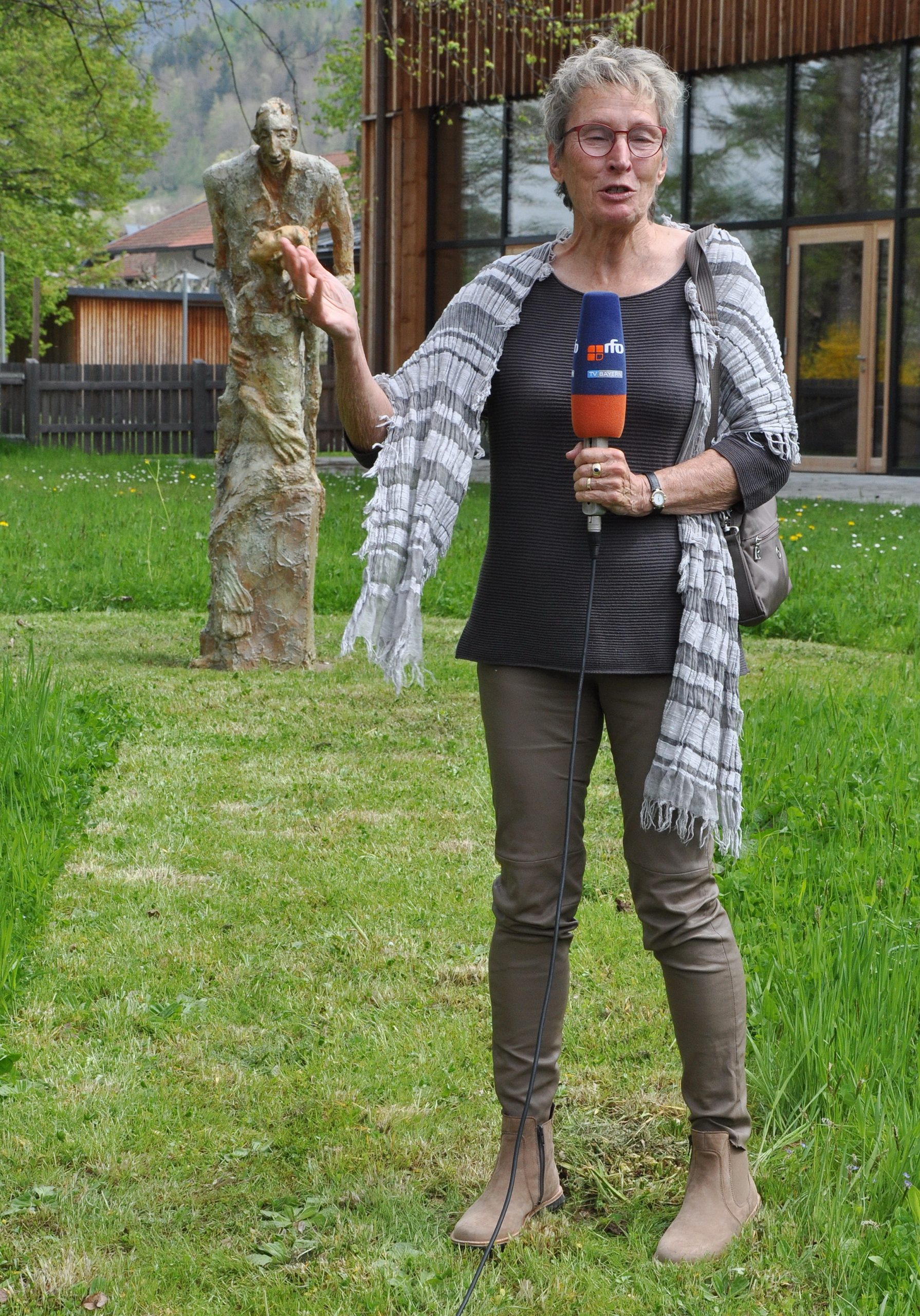 die Wössener Künstlerin Monika Stein bei der Erläuterung ihres Werkes „Die Zwei“, welches Teil des Skulpturenpfades ist und sich vor der Achental Halle des Alten Bades in Unterwössen befindet.