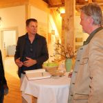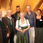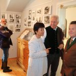 - Bei der Ausstellungseröffnung (von links) Ehrenvorstand Simon Bauer vom Sachranger Trachtenverein – Buchautor Wolfgang Bude – die jetzigen Besitzer der Schule von Stein Jorge und Jürgen Schwarz – davor die zweite Vorsitzende des Müllner Peter Museumsvereins Brigitte Peters und Schriftführerin Martina Glatt