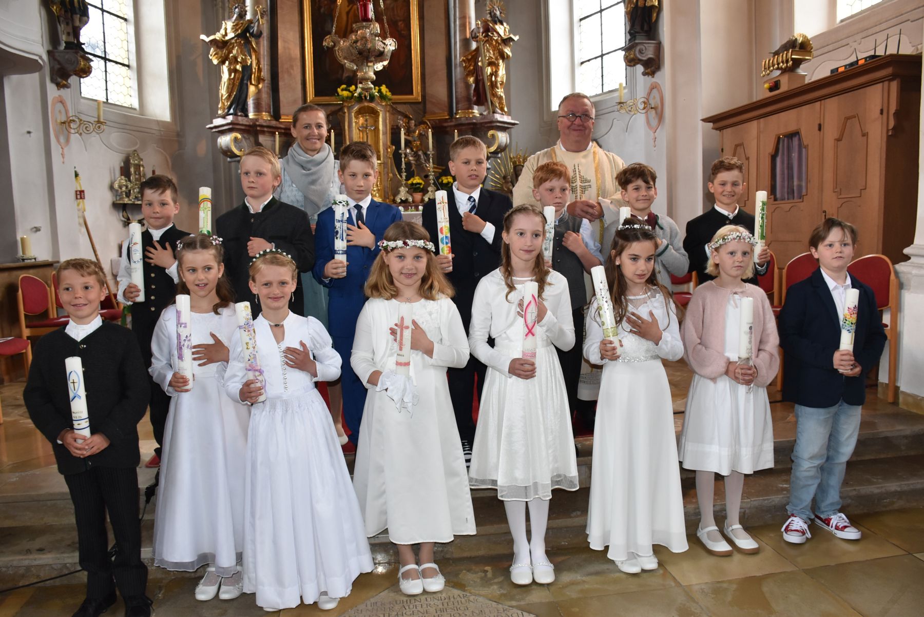 vordere Reihe von links Moritz, Franziska, Diana, Anna, Annalena, Paula, Josefa, Pius Dahinter von links Korbinian, Valentin, Johannes, Tobias, Reto, Elias Dahinter Religionslehrerin Stefanie Berg und Pfarrer Peter Bergmaier