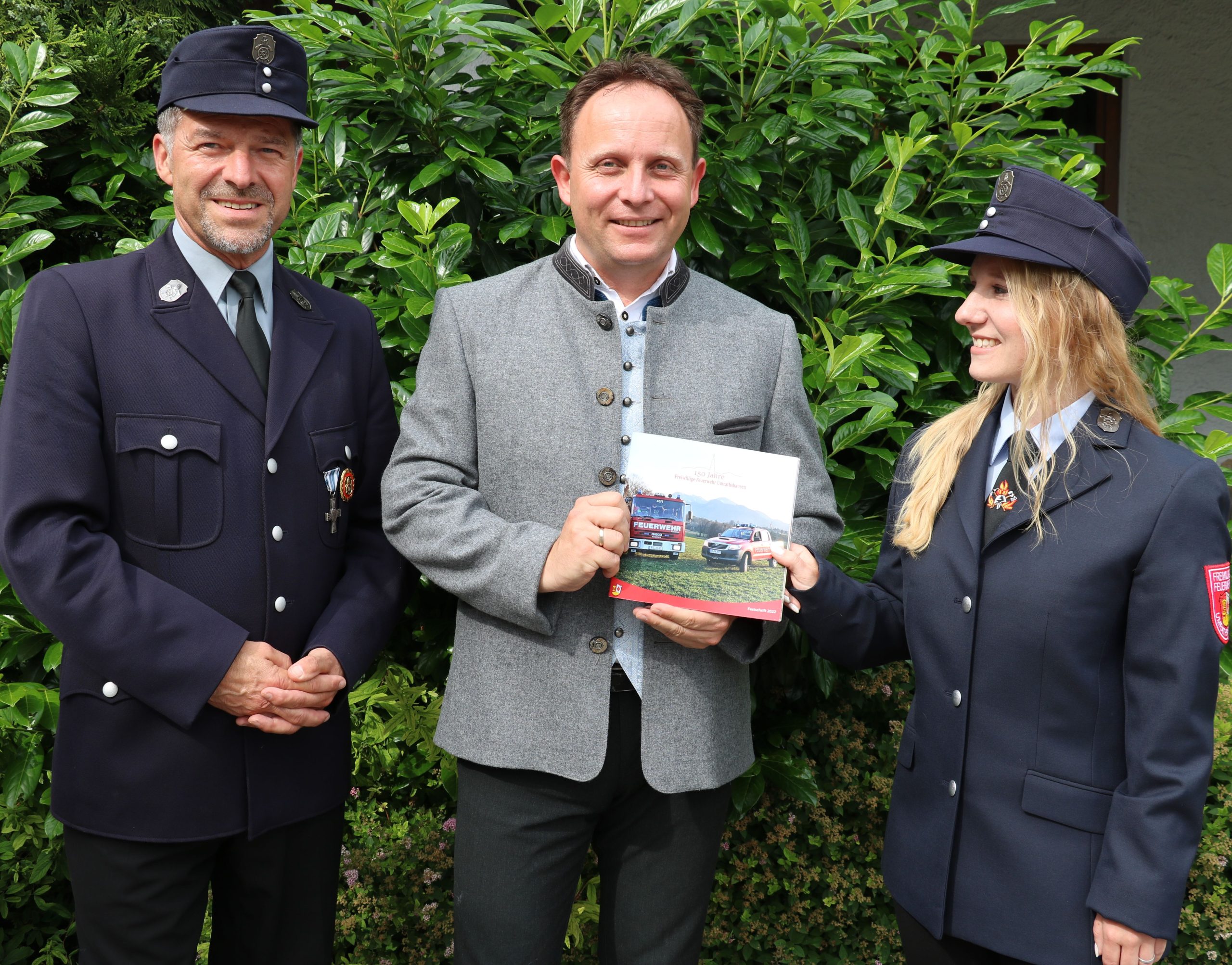 Der erste Vorsitzende der Feuerwehr Umrathshausen Georg Noichl und Autorin Elisabeth Schäffer übergaben das erste Exemplar der druckfrischen Festschrift zum 150-jährigen Vereinsjubiläum an den Schirmherrn des Festes Bürgermeister Daniel Mair.