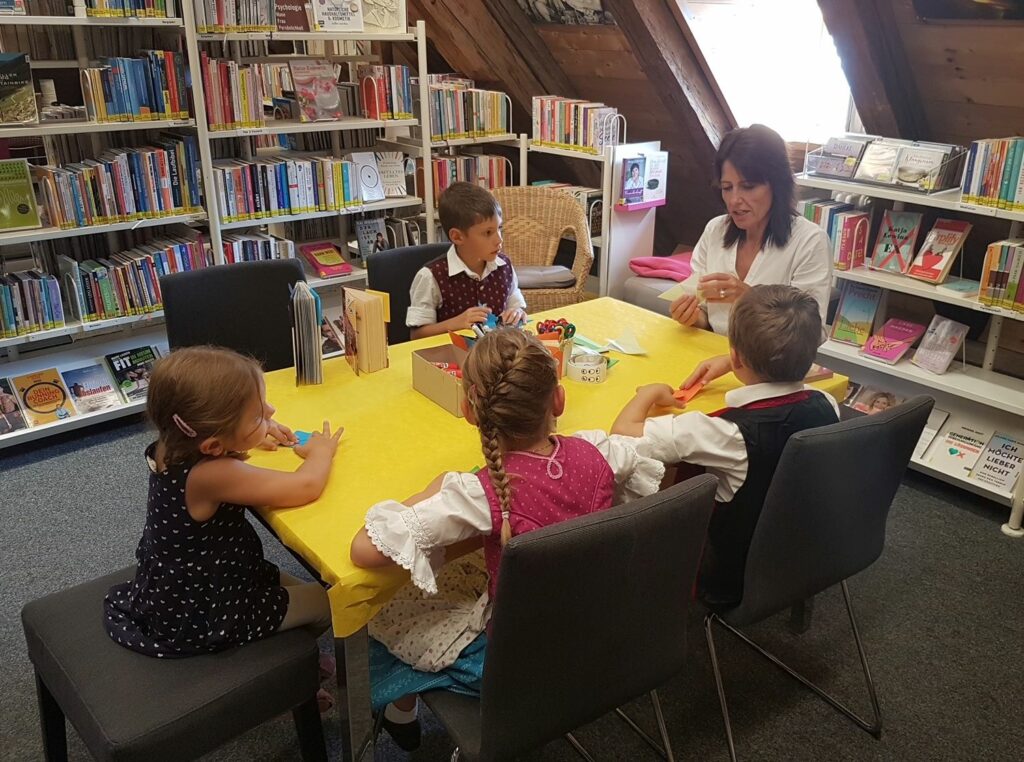 Schulstart-Aktion mit Basteltisch in der Bücherei Prien: Gemeinsam mit Büchereimitarbeiterin Bianca Radlinger basteln die kleinen Besucher:innen Lesezeichen für die ersten selbstgelesenen Bücher.