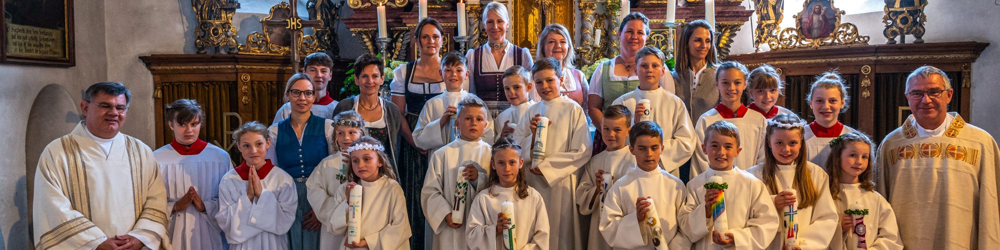 Für 13 Mädchen und 15 Buben der Gemeinde Samerberg war der Sonntag ein ganz besonders schöner und intensiver Festtag. Sie feierten ihre Erstkommunion und durften zusammen mit ihren Eltern, Großeltern, Geschwistern und Angehörigen in der Pfarrkirche Mariä Himmelfahrt den Leib Christi in Form der Hostie empfangen. Aufgeteilt in zwei Gottesdienste unter Leitung von Pfarrer Robert Baumgartner und Diakon Günter Schmitzberger standen in beiden Messen natürlich die Kommunionkinder im Vordergrund. Es wurden hierfür Lieder und kleinere Aufführungen einstudiert, sowie Textpassagen vorgelesen. All dies wurde mit der Unterstützung von 9 Gruppenleiterinnen bereits Wochen zuvor vorbereitet. In der Vorbereitungszeit auf die Erstkommunion lernten die Kinder unter anderem die Bedeutung von Brot und Wein und des Abendmahls für die katholische Kirche, aber auch, welchen Stellenwert Jesus Christus im Leben eines Gläubigen hat. Zudem werden den jungen Mitgliedern der Glaubensgemeinschaft die Geste des Bekreuzigens erklärt und beigebracht.